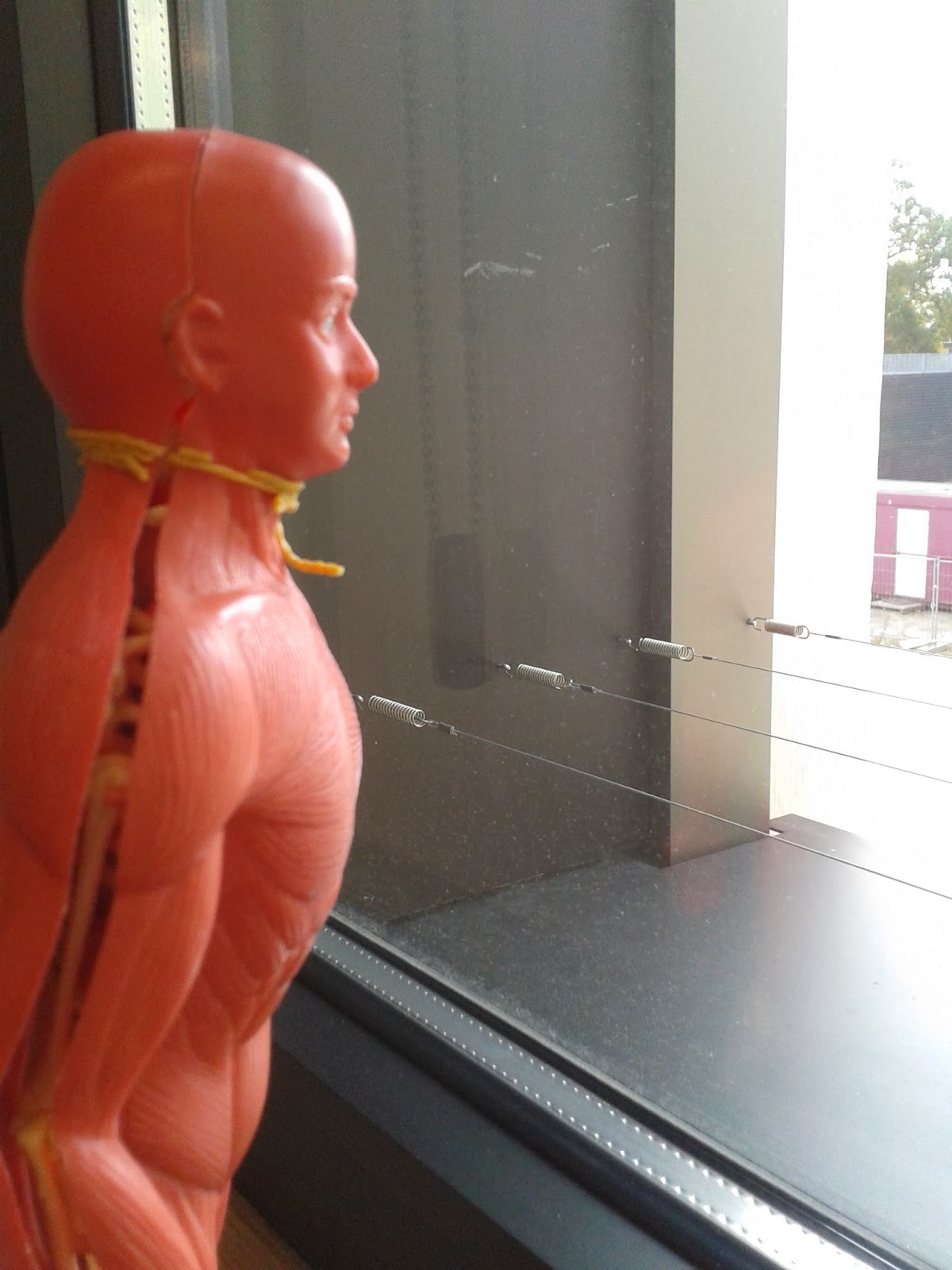 quasi uit het raam kijkend.